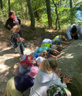 Teufelsstein: Sind wir gemeinsam stärker als der Teufel? – Versuch der Hortkinder aus Blankensee, den Teufelsstein im Hullerbusch zu verschieben
