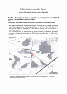 Die Gemeindevertretung Millienhagen-Oebelitz hatte am 14.05.2024 die Aufstellung des Bebauungsplans Nr. 3 „Therapiezentrum im LPG-Hof Oebelitz“ Gemeinde Millienhagen-Oebelitz beschlossen. Die Planung betrifft das in Abbildung 1 umgrenzte Gebiet. Das Verfahren wird als Bauleitplan im Regelverfahren durchgeführt. Es erfolgt hiermit eine frühzeitige Beteiligung der Öffentlichkeit gem. § 3 Abs. 1 und § 4 Abs. 1 BauGB.