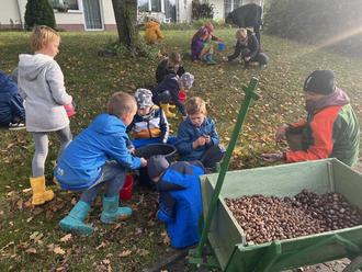 Am 25.Oktober haben wir uns erneut zu einem Klassennachmittag getroffen. Diesmal bastelten wir erst gemeinsam in der Schule und machten uns dann auf, um in Velgast nach Eicheln und anderen Wildfrüchten Ausschau zu halten. Mit vielen kleinen Eimern und einem Bollerwagen ausgestattet, begannen wir unsere Sammlung direkt vor der Schule. Weiter ging es in Richtung Bussin. Dort fanden wir noch reichlich Eicheln und füllten unseren Bollerwagen randvoll. Tatkräftige Unterstützung erhielten wir auch dieses Mal von einigen Eltern und größeren Geschwistern. Beim Sammeln lernten wir nebenbei, warum die Tiere im Winter die Wildfrüchte brauchen und welche verantwortungsvolle Aufgabe wir unterstützen. Viele Kinder wollten auch an anderen Nachmittagen weiter sammeln und unsere Wildfruchtlieferung weiter bereichern. Die Waldtiere werden sich sicherlich daran erfreuen.