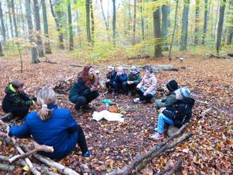Mitten im Wald wartete eine besondere Aufgabe auf uns - der Bau eines Nestes für das Eichhörnchen Edda. Ein Anfang war schon gemacht und wir bauten den Kobel mit kleinen Baumstämmen, Ästen, Zweigen und Laub fertig.