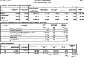 (1) Die Gebühr wird nach Berechnungseinheiten (BE) entsprechend dem Beitragsbuch des Wasser- und Bodenverbandes „Trebel“ festgesetzt. Die Berechnungseinheit (BE) ab dem Berechnungsjahr 2024 wird mit einem Hebesatz von 21,02 €/BE zugrunde gelegt. Darin ist einmalig die Minusdifferenz in Höhe von 4.526,84 € für den Umlagezeitraum 2021 bis 2023 zu den Gesamtkosten gerechnet und kalkuliert worden.