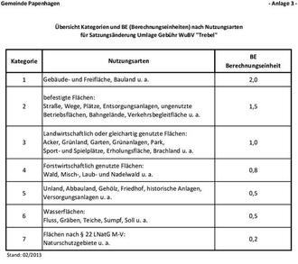 | Anlage 3 | Übersicht Kategorien und BE nach Nutzungsarten für Satzungsänderung Umlage Gebühr WuBV „Trebel“ |