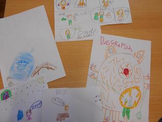 Los ging es mit dem Buch „Ungeheuergeschichten“. Alle Kinder haben gespannt zugehört und konnten alle Fragen rund um das Thema beantworten. Am nächsten Tag haben alle Kinder die Aufgabe bekommen, ein Bild über die verschiedenen Ungeheuer zu gestalten. Zum Beispiel wie sieht das Grabsch, das Nörgel, das Püftz in ihren Vorstellungen aus. Sie waren mit ganz viel Spaß und Freude dabei und haben gezeigt, wie wichtig Freundschaften für sie im Alltag sind.