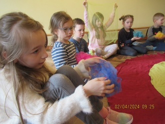 Am 03. April hatten wir zum zweiten Mal Besuch von Heike. Die Mitarbeiterin der Musikschule Spiel und Klang erweckte mit den Kindern den Frühling. Das Murmeltier (Kleine Handpuppe) hatte in seinem Frühlingsbeutel viele bunte Tücher, die mit ihren Farben den Frühling zum Erwachen brachten. Sie schwebten über die Kinder hinweg, die sachte von ihnen gekitzelt wurden. Mit einem Tuch in den Händen ließen alle kleine Blumen erblühen. Ein kleines Gedicht half dabei. Danach durften sie sich Instrumente aussuchen und brachten mit ihnen das Gedicht zum Erklingen. Gymnastikbänder verwandelten die Kinder in Frühlingsbänder und tanzten mit ihnen durch den Raum. In den Pausen wurden die Kinder zu Regenwürmern, Schnecken und Straßen.