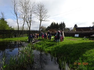 Am 17. April besuchte uns der Landesanglerverband mit seinem Info Bus. Die beiden Mitarbeiter Christoph Wittek und Frank Dabelstein bauten an unserem Feuerlöschteich in Buchholz eine Beobachtungs- und Forschungsstrecke auf. Mit einem Netz holten die Männer viele interessante Lebewesen aus dem Teich. Diese verteilten sie dann in Beobachtungsschüsseln. Die Kinder konnten mit Hilfe von Pipetten kleine Tiere und kleine Pflanzen aufsaugen, in ein Wasserglas geben und unter dem Mikroskop beobachten.