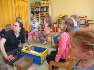 Im Rahmen unseres Haustierprojektes besuchte uns am 03.Mai 2024 die Tierärztin Frau Dähnert. Sie erzählte uns etwas über ihre Tätigkeit als Tierärztin und hatte auch ein Stethoskop und Spritzen dabei. Damit wir es uns alles gut vorstellen konnten, hatte Frau Dähnert viele Haustiere aus Holz mitgebracht. Es waren oft Familien mit Mutter, Vater und Kind.