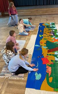 Nun war die dritte Klasse an der Reihe. Bei ihnen drehte sich alles drehte um fossile Brennstoffe. Zu Beginn nahm uns die Umweltclownin mit auf eine Fantasiereise, bei der ebenfalls ein Schatz gesucht werden musste. Die Kinder sind abgetaucht und in der Dinosaurierwelt wieder aufgestiegen. In einem Gruppenpuzzle haben die Kinder zuerst in Kleingruppen ein Puzzle zum Thema Dinosaurier fertig gestellt. Dann wurde aus den vier kleinen Puzzles ein großes. Dabei hatten die Schüler/innen sehr viel Spaß. Die Clownin erklärte anschließend alles über Erdöl, wie es entstand und wozu es dient. Durch eine schnelle Drehung des Puzzles waren die Kinder plötzlich an der Nordsee. Für die Kinder war es unvorstellbar, dass Erdöl und Erdgas von den Dinosauriern stammen. Anhand einer Landkarte wurde gezeigt, aus welchen Ländern Deutschland das Erdgas bekommt und wie es transportiert wird. Am Ende wurde der Schatz gefunden und die Kinder waren durch und durch begeistert…wieder gab es viele glitzernde Steine.