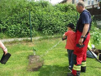 Mit dem Schlauch des Einsatzwagens wurden die Pflanzen gut versorgt und die Kinder hatten Ihren Spaß beim Gießen.