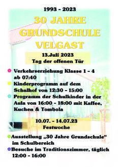 Wir laden alle interessierten ehemaligen Kolleginnen und Kollegen, Schülerinnen und Schüler, sowie die ehemaligen Angestellten und Freunde der Velgaster Grundschule zum Jubiläum 30 Jahre Grundschule Velgast 1993 - 2023 sehr herzlich ein!