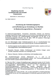 Im Bodenordnungsverfahren „Thomashof“, Gemeinden Tribsees und Drechow, Landkreis Vorpommern-Rügen wurden auf Grund eines Änderungsbeschlusses vom 01.09.2004 Flurstücke zum Verfahrensgebiet hinzugezogen, für die gem. § 34 Flurbereinigungsgesetz (FlurbG) vom 16. März 1976 mit späteren Änderungen folgende Veränderungssperre angeordnet wird: