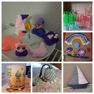 Aber ich bin euch noch die letzten Arbeiten vor der Sommerpause schuldig. Viele getupfte Gläser und Flaschen für die Sommerparty, süße Figuren aus lufttrocknender Masse in herrlichen Farben, ein alter Glaslampenschirm wird geschmückt mit Makramegarn und einer Aufhängung, aus Konservendosen entsteht aus Leim und Servietten eine Aufbewahrung mit kugeligen Füßchen sowie passend zum Sommer ein Segelbootkissen für die Gartenbank. Tolle Sachen, die Spaß machen.
