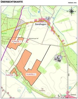 Planteil 3 mit einer Flächengröße von etwa 5,1 ha umfasst Teilflächen der Flurstücke 2/1, 3/1 und 5/4 in der Flur 2, Gemarkung Sandhagen.