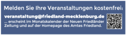 | Di. 24.12. | 14:30 Uhr | Lebendiger Adventskalender Kirchengemeinde St. Marien: Krippenspiel in Friedland und anderswo |