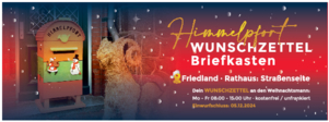 Einen persönlichen Wunschzettel an den Weihnachtsmann zu schreiben gehört zur Vorweihnachtszeit einfach dazu!. Deshalb wird der bunte Himmelpfort-Briefkasten auch in diesem Jahr wieder vor dem Friedländer Rathaus stehen. Die Weihnachtspost kann vom 25.11. - 05.12.2024 kostenfrei / unfrankiert in den bunten Briefkasten getan werden.