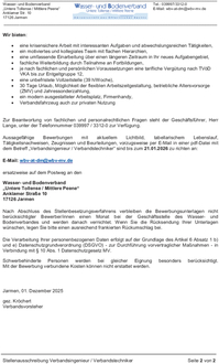 Nach Abschluss des Stellenbesetzungsverfahrens verbleiben die Bewerbungsunterlagen nicht berücksichtigter Bewerber/innen einen Monat bei der Geschäftsstelle des Wasser- und Bodenverbandes und werden danach vernichtet. Wenn Sie die Rücksendung Ihrer Unterlagen wünschen, legen Sie bitte einen ausreichend frankierten Rückumschlag bei.