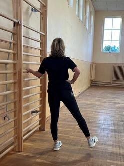 Stellen Sie sich neben einen Stuhl oder an eine Wand und halten Sie sich sicher fest. Ein Bein wird langsam seitlich angehoben, ohne dass der Oberkörper sich zur Seite neigt. Der Fuß zeigt nach vorne. Das Bein anschließend ruhig wieder absetzen.