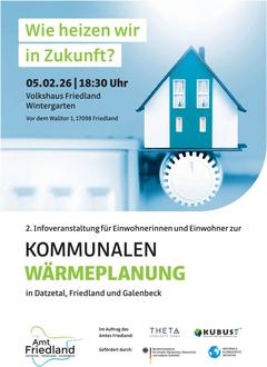 Das Amt Friedland lädt alle Bürgerinnen und Bürger der Stadt Friedland und der Gemeinden Galenbeck und Datzetal herzlich zur Abschlussveranstaltung im Rahmen der kommunalen Wärmeplanung ein. Diese findet am Donnerstag, dem 05. Februar 2026 um 18:30 Uhr im Volkshaus Friedland statt.