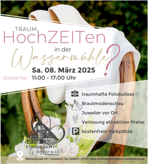 Am Samstag, den 8. März 2025, verwandelt sich die historische Wassermühle in Friedland in eine Oase der Liebe und Inspiration. Von 11:00 – 17:00 Uhr lädt das Standesamt zu einer exklusiven Hochzeitspräsentation ein, bei der Brautpaare alles finden, was ihr Herz begehrt.