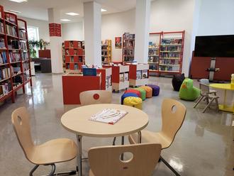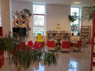 Alle Kinder, die gern selbst in Bibliotheksräumen lesen, können es sich auf unseren lustigen, neuen Sitzkissen bequem machen. An der Sitzgruppe kann geschrieben und gemalt werden.