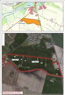 Der räumliche Geltungsbereich des Bebauungsplans ist der beigefügten Übersichtskarte zu entnehmen. Er beläuft sich auf eine Größe von etwa 49,0 ha und umfasst die Flurstücke 165, 166 (tlw.) und 167/3 (tlw.) der Flur 50 sowie die Flurstücke 1 (tlw.), 2 (tlw.) und 7/2 (tlw.) der Flur in der Gemarkung Friedland.