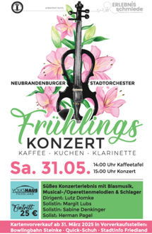 Kommen Sie ab 14:00 Uhr bei Kaffee und Kuchen mit Bekannten ins Gespräch. Ab 15:00 Uhr erklingen schwungvolle Melodien, klassische Meisterwerke und beliebte Filmmusik - ein musikalischer Nachmittag, der Frühlingsgefühle weckt. Die stimmungsvolle Atmosphäre und die klangvolle Vielfalt machen das Konzert zu einem perfekten Geschenk für Musikliebhaber.