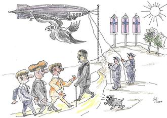 Geseggt – gedan, de Vörbereitung von de Luftfohrt güng unverzüglich los: De Digedags köfften orrig Proviant in, nehmen ok een Zelt mit, dat se in de Dünen von de Nuurdsee upbuugen wullen. Nu kem de lang ersehnte Dag von denn` Luftschippstart in`n Junimaand ran. Dr. Eckener luerte all up denn` Helpterbarg bie Woldegk up de dree Digedags un ehren Papagei. He vertellte denn` Digedags dat König Haakon VII von Norwegen ok an Buurd wier – dee wull dunn mit siene Fruu de malerische Feldbarger Seenlandschaft besöken.To siene Ihrung wieren dree norwegische Flaggen hißt. Dat Luftschipp wier an eenen Mast fastbunnen un twee Kierls höllten de Lienen fast, kort dorup stäg dat Königspoor ut. Dat Wäder wier phantastisch - blaager Häwen un lichten Süüdwest Wind, wat wullen de Dwargen un ehr Dokter noch mihr? Dee kladderte as Ierster in de Gondel, dunn de Digedags un to`n Enn de Hund „Veedol“ de luut Coco anbellte. De Vier makten sick dat in ehr Kabinen orrig bequem, güngen dunn to de Führergondel üm denn` Buurdkaptein „Goden Dag“ to seggen. Dee harr all de Motoren anschmäten laten un freugte sick oewer denn´ Besöök von Dr. Eckener un denn` Digedags. Coco künn wedder sienen Schnabel nich hollen un kreihgte Befehle as „Ruder nah linksch“ un ähnlichen Himphamp to de Buurdmannschaft, dee oewerrascht wier. Digedag hett em dunn orrig tosamenschäten un entschulligte sick dunn bie denn` Kaptein. De Chef von dat Luftschipp lachte blots un löd` dunn all siene besünneren Gäst` to een Tass Koffie in. Dunn zeigte he Dr. Eckener un denn` dree Kobolden de Flugroute up een groten Koord. Von`n Helpter Barg süll dat dat wieder oewer Swerin, Lübeck to dat däänsche Halweiland Jütland gahn. De Digedags makten väl Photos von de Ierd ünner ehren Luftschipp as all de Lüchttorm Rubjerg Knude von Lökken updükte. Langsam senkte sick dat Luftschipp af un makte an eenen Mast in Nuurdjütland fast. De Digedags rümten ehren Krims-Krams ruut un verafscheedten sick von Dr. Eckener, de Buurdmannschaft un von Veedol. Dunn söchten se sick eenen geeigneten Platz an de Düne von Lökken ut, wur se ehr Zelt upbuugten. Digedag ielte dunn to`n Strand üm glieks nackt in de Nuurdsee to störten! Dig un Dag wier dat Water noch to kolt, se güngen nur mit de Fööt rin in`t Water un spälten dunn Fedderball an`n Strand. Coco dörfte ümmer de verhaugenen Fedderbälle upsammeln un disse an de beiden Spälers oewergäben. `N bäten later hemm` uns dree Dwargen nu Hunger krägen, dorüm söchten se in`n Küstenwold von Lökken dunn Päperlings. Kiek an, Coco sehg all von baben een groten Poggenstohlhexenring mit oewer hunnert groten Päperlings! Dat Abendäten wier rett`t!