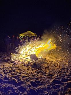 Schön stürmisch und dennoch ein großer Spaß, Weihnachtsbaumrecycling am Strand. Schon vormerken: am zweiten Samstag im Jahr 2025 brennen wir wieder.