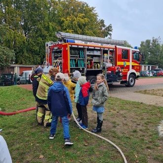 Am 8.Oktober fand an unserer Schule ein Projekttag zum Thema "Brandschutzerziehung" statt. An 7 Stationen konnten sich unsere Kinder zum Thema "Brandschutz" informieren und ausprobieren. Auf dem Schulhof stand die Feuerwehr und Frau Pfeffer und Herr Kröppelien von der FFW Graal- Müritz. Sie stellten das Fahrzeug genauer vor und die Kinder konnten das Löschen mit einem Feuerwehrschlauch ausprobieren.