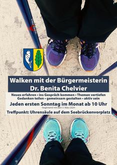 Nach einer CORONA bedingten Pause habe ich mich wieder entschlossen, das „Walken mit der Bürgermeisterin“ anzubieten; immer am ersten Sonntag im Monat; beginnend ab 03. März. Nutzen Sie die Gelegenheit und kommen mit mir, aber auch anderen Bürgern und Gästen, ins Gespräch. Neben der leichten sportlichen Betätigung können wir Neuigkeiten austauschen und sicherlich auch die eine oder andere Frage klären. Oder Sie zeigen mir, was in unserem Ort gut ist oder verbessert werden kann. Natürlich können Sie mich auch jederzeit im Rathaus besuchen, mir schreiben oder mit mir telefonieren. Ich bin für Sie da und freue mich auf Sie.