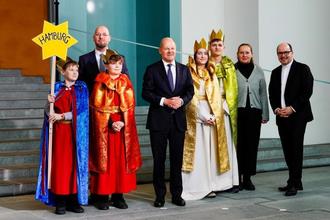 Nachdem wir, eine kleine Gruppe Sternsinger, als Vertreter für das Erzbistum Hamburg ausgelost wurden, um dem Bundeskanzler am 07.01.25 den Segen bringen zu dürfen, reisten wir mit insgesamt 26 weiteren Bistümern aus ganz Deutschland nach Berlin. Mitkommen durften 4 Sternsinger und 2 Begleitpersonen. Aus unserer Gemeinde haben sich Lukas, Jakob, Jonas und Theresa auf den Weg gemacht – begleitet wurden wir von Herrn Prassl und Frau Dupke. Angereist sind wir schon einen Tag vor dem Empfang, am 06.01.25. Am Vormittag startete unsere Fahrt mit dem IC in Richtung Dresden Hbf und nach knapp 2h 37 kamen wir in Berlin an. Unsere Unterkunft war die „Jugendherberge Berlin Ostkreuz“. Nach der Anmeldung bei den Organisatoren der Veranstaltung hatten wir noch kurz Zeit, Berlin zu erkunden, bis es in der Jugendherberge Abendessen gab. Nach der Generalprobe, bei der der Ablauf nochmals erklärt wurde, und dem anschließenden Abendgebet trafen sich alle Begleiter noch zu einem gemeinsamen Abend. Morgens aßen wir nur noch Frühstück und packten unsere Sachen, bevor wir mit den Bussen der Bundespolizei zum Bundeskanzleramt fuhren. Erwähnenswert ist, dass nur eine der Begleitpersonen mit in das Bundeskanzleramt kommen durfte, für die andere Person war ein Programm geplant, bei dem ein paar Berliner Wahrzeichen besucht wurden. Angekommen im Bundeskanzleramt wurden alle Taschen und Besucher kontrolliert. Daraufhin hatten wir noch Zeit, uns ein wenig umzuschauen, bis wir uns mit Mantel und Krone bekleideten.