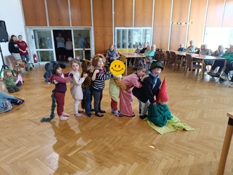 …alle Omis und Opis warteten schon sehr gespannt auf uns. Die Freude und das Glück konnte man in ihren Augen sehen. Wir haben dann freudig gesungen und uns rhythmisch dazu bewegt, getanzt und geklatscht. Lieder von der Jahresuhr, über unsere Gefühle und unseren Körper, sowie unser Kindergartenlied kamen gut an. Sogar ein Lied in Englisch können wir schon singen. Dann zeigten wir unser Märchen vom Rübchen, was uns sehr viel Spaß gemacht hat. Besonders, wenn alle Kinder beim Herausziehen umfallen, weil die Rübe so riesig gewachsen ist und feststeckt. Hätten da nicht die Mäuschen geholfen…