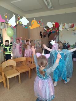 Zwei Tage später war es dann endlich soweit, dass wir uns wieder verkleiden durften. Eines der tollsten Feste wurde in all unseren 4 Häusern gefeiert: Fasching! Kunterbunt mit Musik, Instrumenten, Luftballons, und tollen Kostümen. Da konnten wir mal richtig laut und verrückt sein. Stuhlpolonaise und Luftballontanz durfte auch nicht fehlen, sowie Berliner essen und Rucki Zucki tanzen.
