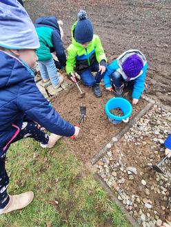 Am 21. März 2023 führten wir unser „Frühlingserwachen im Schulgarten“ mit den Kindern unserer Ostsee-Grundschule durch. Mit Unterstützung des Gemeindlichen Bauhofes konnte die große Beetfläche für die Aussaat vorbereitet werden. In den ersten drei Unterrichtsstunden arbeiteten die Klassen an verschiedenen Themen. Die Klasse 1 widmete sich dem Thema Ostern, Klasse 2 beschäftigte sich mit der Wiese und den dazu gehörenden Pflanzen und Tieren. Klasse 3 erforschte das Thema Frosch, Klasse 4a lernte etwas zu den Bienen und Klasse 4b untersuchte die Schnecke. In der vierten Stunde trafen sich alle im Schulgarten und eröffneten die Saison mit einem Lied, welches mit Bewegungen untermalt wurde. Kinder aus der vierten Klasse trugen einen Tanz vor. Im Anschluss daran wurden die Aufgaben rundum den Schulgarten verteilt. Die Kinder der ersten Klasse säuberten den Barfußweg und stellten Saatkugeln her. Klasse 2 baute Flatterbänder für das Beet, um die Vögel von unseren Samen fernzuhalten. Die dritte Klasse bestückte Insektenhotels und dekorierte Kressenester. Auch die Kinder der vierten Klasse waren tatkräftig unterwegs: Sie schraubten Bretter für den Mittelweg zusammen, halfen bei den Kressenestern, steckten die Beete ab und erneuerten ein paar Beetschilder. Dank der Unterstützung unserer Elternschaft war auch für das leibliche Wohl an diesem Projekttag gesorgt - ein herzliches DANKESCHÖN! Es war ein rundum gelungener, wunderbarer und sehr erfolgreicher Vormittag. In der darauffolgenden Woche gab es einen kleinen Stand in der Schule. Dort nutzten viele Eltern die Gelegenheit, Produkte von unserem Projekttag gegen eine freiwillige Spende zu ergattern.