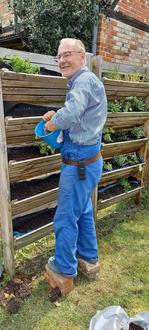 Der Mann will hoch hinaus - man beachte die schicken Schuhe und natürlich das zarte Pflänzchen‚ (also im Hochbeet)