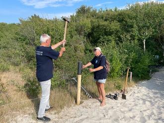 Gesagt, getan. Am Freitag 16.06.2023 trafen sich die ersten Mitglieder zur Kontrolle und Reparatur der Dünenabzäunung. Die Gemeinde stellte das Material zur Verfügung und schnell konnten Pfosten und Draht der Strandausgänge 1- 6 in Ordnung gebracht werden.