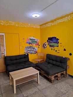 Zur neuen Ausstattung gehören ein Whitboard sowie Paletten mit Sitzkissen. Zusätzlich wurden die Wände mit Wandtatoos verschönert.