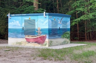 Die E.dis hat sich ihrer Verteilerkästen und auch Trafohäuser angenommen. Fast alle wurde mit unterschiedlichen Motiven gestaltet. Ein schönes Beispiel dafür ist das neue Trafohaus in der Straße zur Seebrücke. Das Trafohaus am Parkplatz zur Seebrücke ist im nächsten Jahr dran.