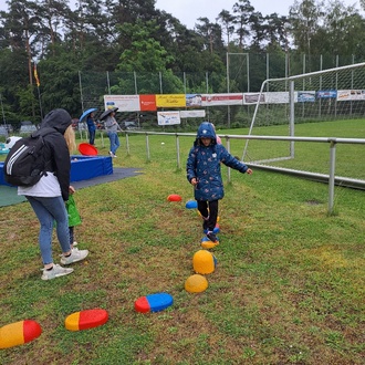 Unsere Kinder ließen sich davon jedoch nicht den Spaß verderben. Auch wenn die Hüpfburg des Landessportbundes auf Grund des Regens nicht genutzt werden konnte herrschte auf allen anderen Stationen reger Betrieb. Ob beim Gummistiefelweitwurf, Fußballbiathlon, Zielwerfen oder auf dem Geschicklichkeitsparcours des Landessportbundes ließ sich niemand vom Regen an der Teilnahme hindern.