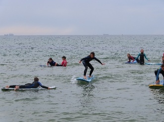 Nach dem Mittag kam endlich die Sonne raus und es wurde richtig warm. Wir konnten an der nächsten Station Volleyball oder Fußball spielen, aber viel lieber wollten wir noch einmal surfen. Deswegen haben wir die Surflehrer überredet, dass wir noch einmal ins Wasser können. Erneut haben wir uns eifrig in die Wellen gestürzt. Einige von uns konnten schon richtig lange auf dem Brett stehen, aber auch alle anderen haben nicht aufgegeben. Das Surfen war definitiv das Highlight des Tages, da waren wir uns alle einig.
