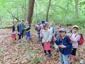Im Anschluss daran wanderte die Klasse 1 mit Frau Jentsch in den Wald, um eine spannende Entdeckung zu machen. Mitten der Bäume liegt ein Stein – ein Grenzstein von früher, der die beiden Ortschaften trennte.