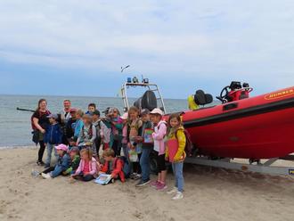 Danach ging es weiter Richtung Strand, denn was ist eine Wanderung im Ostseeheilbad ohne den Strand. Einige Kinder glänzten dort mit ihrem Wissen zu der vorhandenen Seebrücke und den drei früheren bestehenden Brücken. Vor Ort empfingen uns die Retter der DLRG. Freundlich wurden wir begrüßt und aufgeklärt, wie wir uns sicher am und im Wasser verhalten müssen.