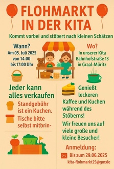 Am 05.07.25 findet wieder unser Flohmarkt für Alle, auf dem Kita-Gelände in der Bahnhofstraße 13 in Graal Müritz, von 14 – 17Uhr statt. Jeder kann mitmachen und/oder stöbern. Die Standgebühr beträgt einen Kuchen. Tische und Stühle müssen selbst mitgebracht werden.