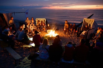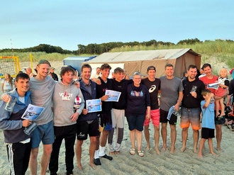 Mit der Genehmigung in der Hand konnte es nun in die heiße Phase der Turnierorganisation gehen. Am Donnerstag wurde der große Anhänger des Wirtschaftshofes der Gemeinde randvoll mit Equipment beladen, dieser wurde bereits um 7 Uhr morgens am Strand Höhe Aufgang 36 bereitgestellt. Nun konnte der Aufbau des Turnierareals bei besten äußeren Bedingungen beginnen. Dank der vielen fleißigen Helfer und eingespielter Routinen standen keine drei Stunden später 18 Beachvolleyballfelder, drei Armeezelte (für Orga, Player und Essen), eine liebevoll eingerichtete Bar (inkl. Pelikan), ein Bierwagen, ein Pavillon, ein Grill und eine Feuerschale so, dass die Bühne für den kommenden Turniersamstag gebaut war. Die Partytauglichkeit der Location wurde bereits in der Nacht vom Freitag zu Samstag, vor allem durch unsere Freunde aus NRW getestet und für gut befunden.