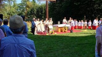 Für alle los ging es dann um 11.00 Uhr auf der Freifläche hinter dem Münster mit einem festlichen Wallfahrtsgottesdienst. Diesen zelebrierte Probst Dr. Georg Bergner aus Schwerin als Dekan für die Region Mecklenburg. Begleitet wurde er von den Priestern unserer Pfarrei.