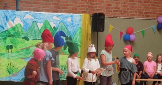 Schüler*innen der Klassen 2 - 4 begrüßten unsere Erstklässler mit einem kleinen Theaterstück. Auch die 7 Zwerge hatten ihren Einschulungstag und waren genauso aufgeregt. Ängstlich und mit schlotternden Zipfelmützen gingen sie in die Zwergenschule. Sie lernten ihre Lehrerin Frau Purzelbaum kennen. Schnell verging ihre Angst und die 7 Zwerge freuten sich lesen, schreiben und rechnen zu lernen und neue Freunde zu finden.