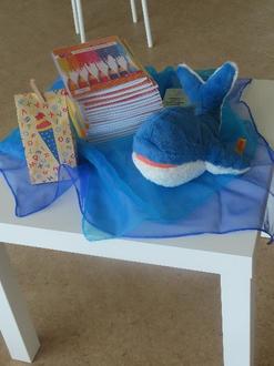 Danach ging es in den liebevoll eingerichteten Klassenraum. Hier lernten unsere Erstklässler ihr Klassenmaskottchen - den Wal - kennen.