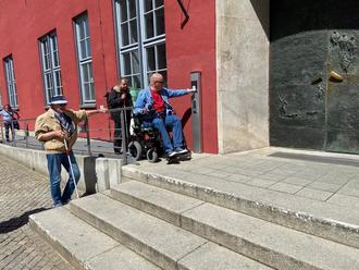 Maximilian Weihs, Jan Gloger und Karl-Heinz Skrock von der AG Barrierefreie Stadt testen den neuen barrierefreien Zugang ins Rathaus
