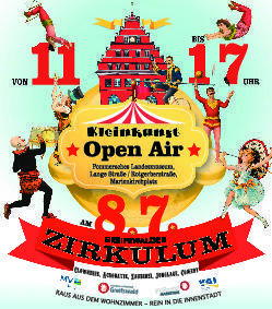 Auf dem Vorplatz des Pommerschen Landesmuseums begrüßen Sie um 11:00 Uhr, 13:00 Uhr und 15:00 Uhr Flash Gonzales aus Chile mit Clown, Magie und Comedy. Zudem begegnen Sie dort La Sofia Popi Speratti aus Argentinien mit Comedy, Handstand und Hoola Hoop um 12:00 Uhr und 14:00 Uhr.
