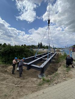 In der Trasse des neuen Geh- und Radweges befinden sich zwei Gräben, die künftig mit Hilfe einer Brücke gequert werden können. Dieses 5,50 m breite und 16 m lange Stahlbauwerk wurde Mitte Juli eingesetzt.
