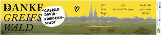 mit dem Ende der letzten Ausstellung in der Spielhalle KUNST geht das Caspar-David-Friedrich-Jubiläumsjahr anlässlich seines 250. Geburtstages zu Ende. Wir bedanken uns bei Ihnen für ein großartiges Veranstaltungsjahr, an dem sich viele von Ihnen als Veranstaltende und Gäste beteiligt haben. Gemeinsam haben wir kulturelle Vielfalt gezeigt und bewiesen, dass Greifswald die wahre Caspar-David-Friedrich-Stadt ist. Danke für zahllose bleibende Eindrücke!